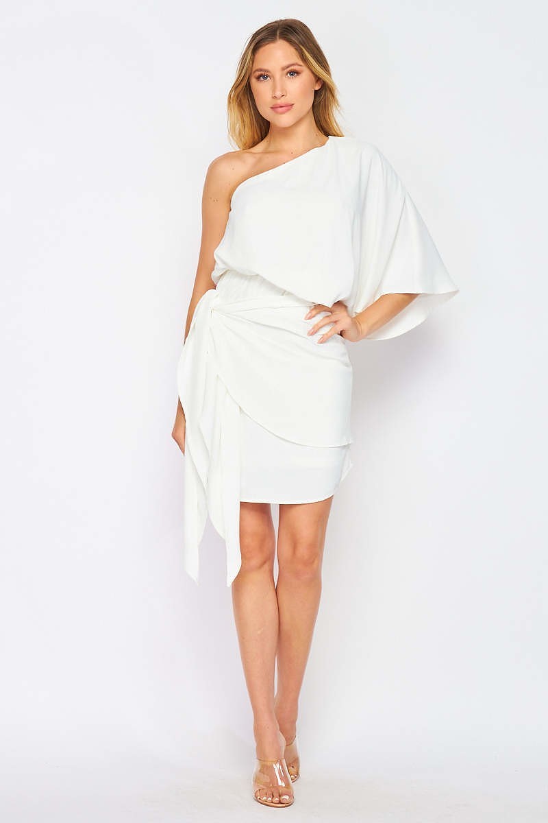Vestido blanco corto, drapeado a la cintura de un solo hombro.